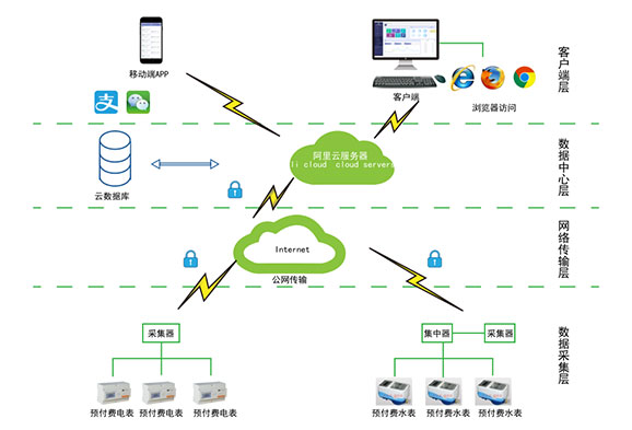對于分布不同省、地市或同地市不同區(qū)域的連鎖商業(yè)、集團、百貨、門店、物業(yè)、院校等業(yè)務分散,要求集中管理、線上支付,低額提醒、欠費告警。但常規(guī)的本地插卡付費、本地預付費并不能完全滿足客戶管理需求,預付費云平臺應運而生。AcrelCloud-3200水電預付費云平臺無縫集成商業(yè)、物業(yè)公司、集團企業(yè)、院校等分散布置的安科瑞DDSY/ADF系列電子式預付費電能表、閥控智能水表等,提供微信、支付寶、銀聯(lián)等可選的在線支付方式,大大方便了用戶充值、圈存,提供預警和充值、退費、電能消耗等記錄查詢,方便用戶和管理方的數(shù)據(jù)統(tǒng)計和財務分析,提供先交費后使用的管控機制,大大降低了管理部門的收費成本。